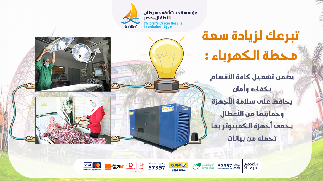لأننا فى 57357 لا نترك شيئًا للظروف، ونهتم بالتخطيط العلمى، والرؤية بعيدة النظر فى كل خطواتنا، فإننا نسعى الآن لإنجاز مشروع من أهم مشروعاتنا فى هذه المرحلة، وهو زيادة القدرة الكهربائية لمحطة الكهرباء التى تُغذى المستشفى بالكامل، لضمان التشغيل الآمن لجميع الأقسام بأعلى كفاءة، والحفاظ على سلامة الأجهزة الطبية، وحمايتها من الأعطال، وحماية أجهزة الكمبيوتر بما تحمله من بيانات ومعلومات.