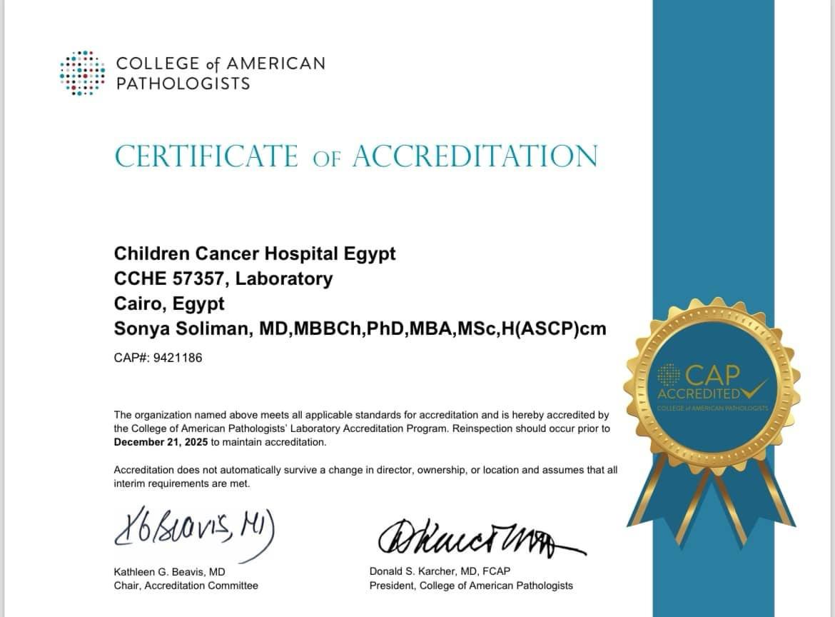 منحت لجنة اعتماد المُختبرات التابعة للجمعية الأمريكية لعلوم الامراض(CAP) اعتمادًا إلى مستشفى سرطان الأطفال ٥٧٣٥٧ – مصر
