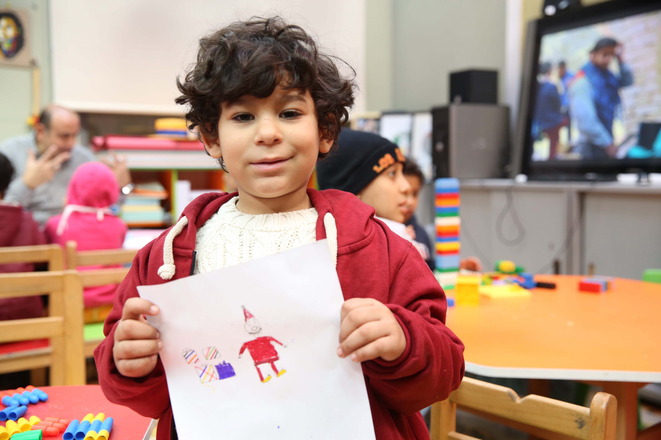 وفى أثناء حديثى مع والدة ديفيد، اقترب منا ديفيد، ليرينا رسمته للعيد التى انتهى منها، وقال دا عمو كروان، فكانت رسمة تعكس ما يشعر به انعكاسا لشعوره بمعنى العيد، ومن هم يمثلون له الفرحة الحقيقية، فقد رسم ديفيد عمو كروان، المهرج، بملابس بابا نويل الذى يحمل الهدايا، هذه الرسمة ليست مجرد تعبير لطفل عن هواية، لكنها انعكاس عما بداخله من أن فرحة العيد يحملها له أحد أصدقائه من فريق عمل المستشفى، وهو عمو كروان، المهرج، فهو بالنسبة له بابا نويل الذى يحمل الهدايا فى الأعياد، ويحقق للأطفال أمانيهم، ما رسمه ديفيد وشعر به من أمان وحب هو أجمل مكافأة لفريق العلاج والمستشفى على جهودهم المتعددة فى تخفيف عبء مشوارعلاج أطفالنا المرضى.