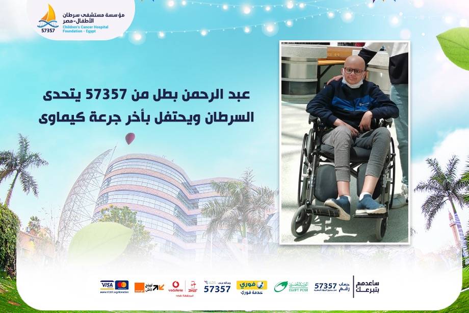 عبد الرحمن بطلنا من القاهرة، عنده 12 سنة ونصف، دخل 57357 فى أغسطس 2021 فاقد الحركة والإحساس فى النصف الأسفل من جسمه، وتم تشخيصه بالإصابة بورم على العمود الفقرى، وتم عمل عملية لاستئصال الورم، وبدأ بعدها عبد الرحمن جرعات الكيماوى لمدة 28 أسبوعًا، وبالتزامن معها حصل على 32 جرعة إشعاعى، وحاليًا عبد الرحمن فى انتظار آخر جرعة كيماوى فى الأيام القليلة القادمة.