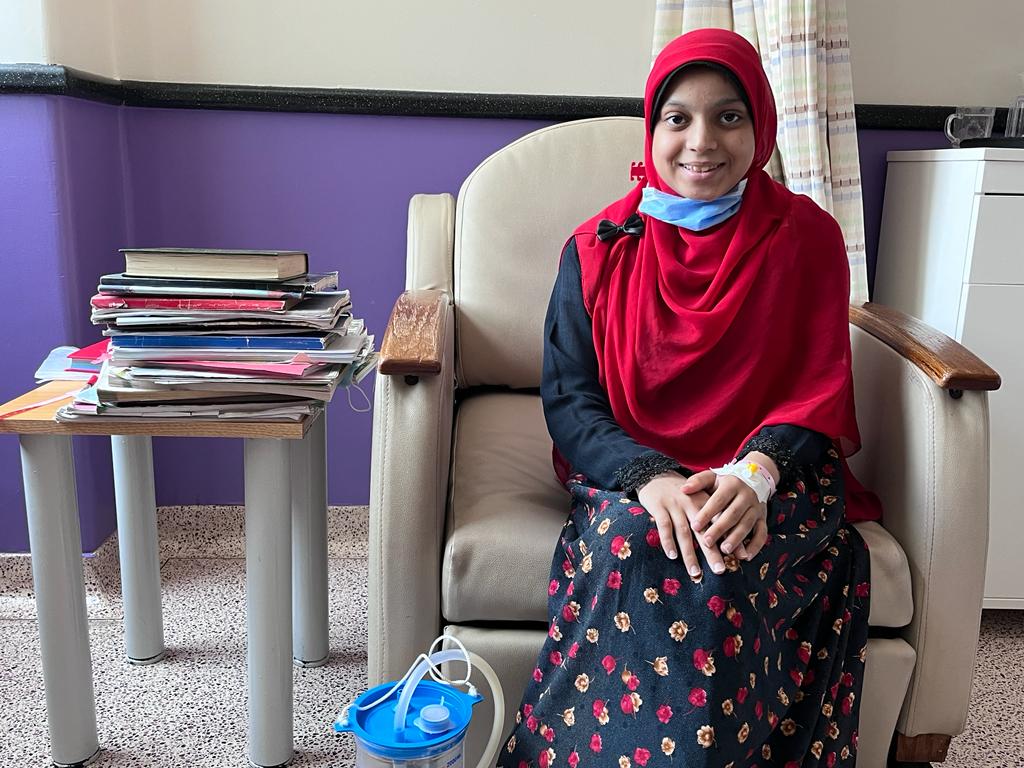 تزامنت امتحانات الثانوية الأزهرية مع بدء ملك لجرعتها الثالثة، لهذا تم عمل كل إجراءات التحاقها بلجنة أبطال 57357، واليوم كان اليوم الثانى فى امتحانات ملك، وبالحديث معها، قالت: “الحمد لله كنت خايفة أضطر أأجل امتحاناتى علشان الجرعات والسنة تروح عليا، ولكن فى المستشفى هنا شجعونى التمريض والدكاترة والمتطوعين وأكثرهم أستاذ طارق المسئول عن امتحانات طلاب 57357، كلهم قالوا لى ذاكرى وما تخافيش، وفعلًا كلامهم واهتمامهم خلانى أذاكر كويس، والنهاردة حليت حلو فى الامتحان، وكنت فرحانة جدًا، ربنا يكرمهم كلهم، على كل حاجة حلوة بيعملوها لى، بصراحة المستشفى موفرة لنا كل وسائل الراحة، وعلاجى باخده فى مواعيده، ربنا يشفينى، وأجيب مجموع كويس، وأدخل كلية صيدلة إن شاء الله”.