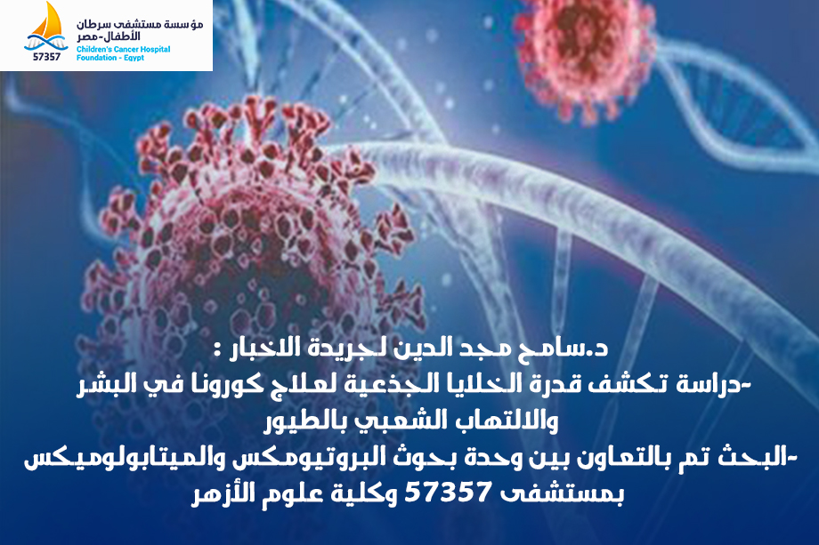 د.سامح مجد الدين لجريدة الاخبار : دراسة تكشف قدرة الخلايا الجذعية لعلاج كورونا في البشر والالتهاب الشعبي بالطيور .. البحث تم بالتعاون بين وحدة بحوث البروتيومكس والميتابولوميكس بمستشفى 57357 وكلية علوم الأزهر