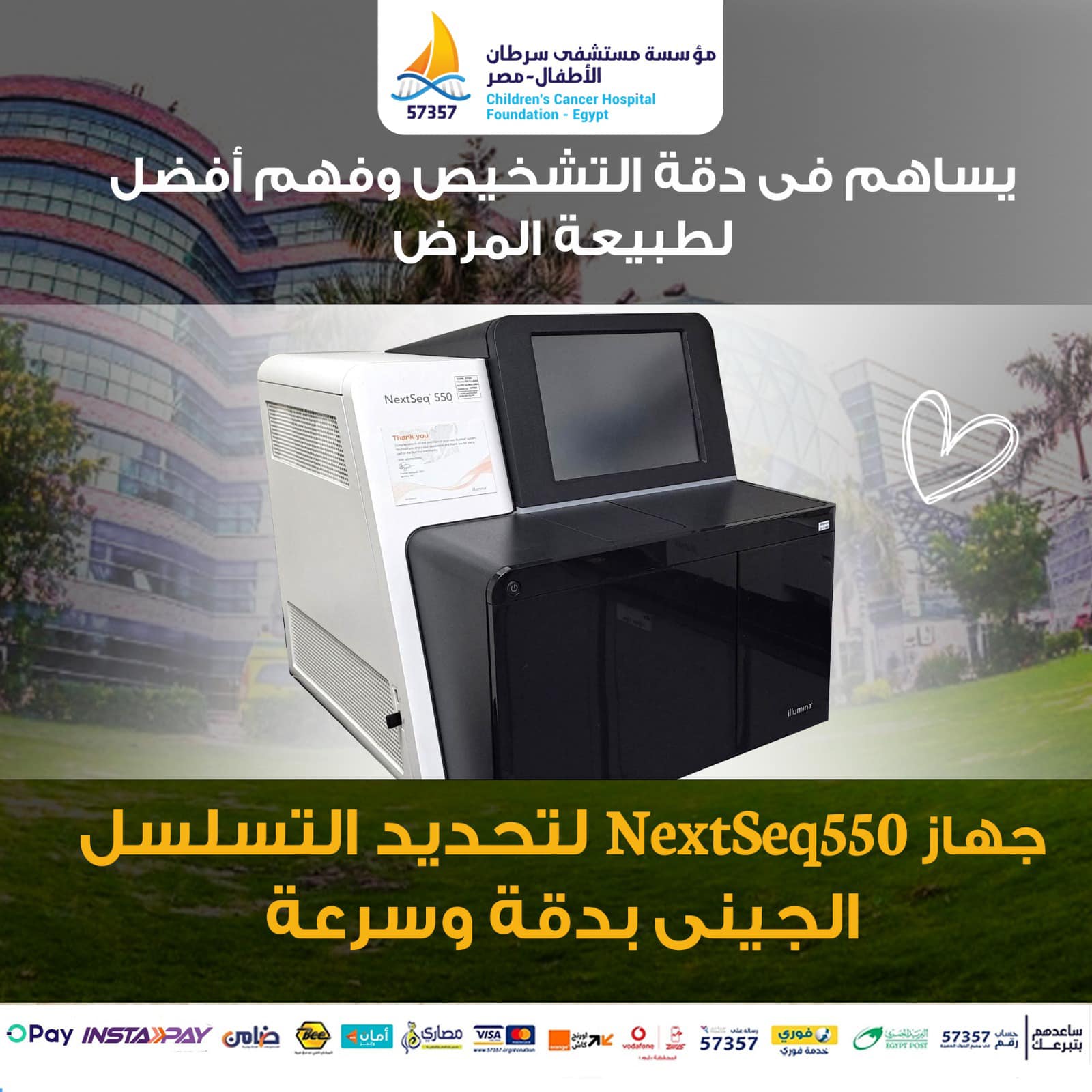 جهاز NextSeq550، من الأجهزة الأساسية فى معمل أبحاث الجينوم فى 57357، ويُعد من تقنيات الجيل القادم فى مجال التعرف على تسلسل الحمض الوراثى، وهو ما يُعطى الباحثين القدرة على تحديد التسلسل الجينى بمنتهى الدقة والسرعة سواء للبشر أو للبكتريا والفيروسات، حيث يُمكن الحصول على نتائج عالية الدقة لعشرات العينات، فى أقل من 48 ساعة، وهو ما كان يستغرق أيامًا عديدة مع التقنيات السابقة . ويُساعد هذا الجهاز فى التعرف بفاعلية على التحورات أو الطفرات الجينية، حيث أن أى تحور بسيط فى تكوين التسلسل الجينى، يُمكن أن يكون سببًا فى المرض أو فى عدم استجابة المريض للعلاج، أو سببًا فى شدة العدوى البكتيرية أو الفيروسية