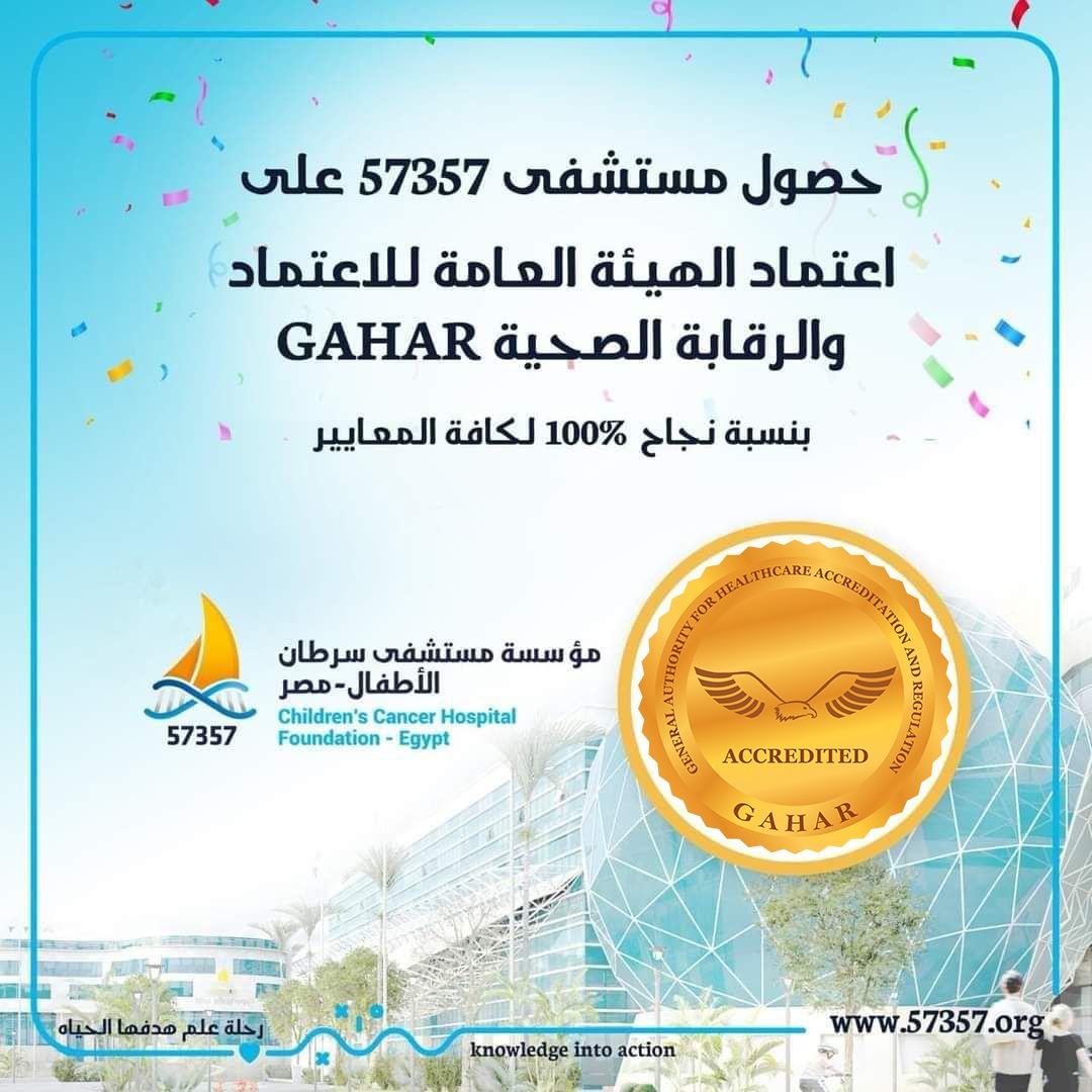 تسلم مستشفى سرطان الأطفال 57357- مصر، شهادة اعتماد هيئة الاعتماد والرقابة الصحية GAHAR..
