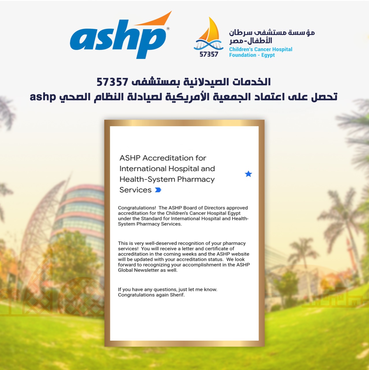 Strenuous collaborative efforts of various departments of the hospital over the past year were finally crowned with ranking CCHE 57357 as the world’s first hospital of its kind (charitable pediatric oncology hospital) to achieve such recognition from the ASHP. The ASHP is an American organization that ensures through its accreditation system, a hospital’s compliance to medication safety and effectiveness standards and procedures, and the delivery of high-quality pharmaceutical care, consequently improving healthcare outcomes. Previously, thanks to ECN Egypt Cancer Network‘s support, 57357 pharmacy obtained the ASHP accreditation of its residency program made available to its pharmacists. The ASHP international pharmacy residency program accreditation has ensured the availability of the needed facilities as well as the exemplary learning environment offered by CCHE 57357’s pharmacy to its pharmacists, making them a role model in the clinical pharmacy field.