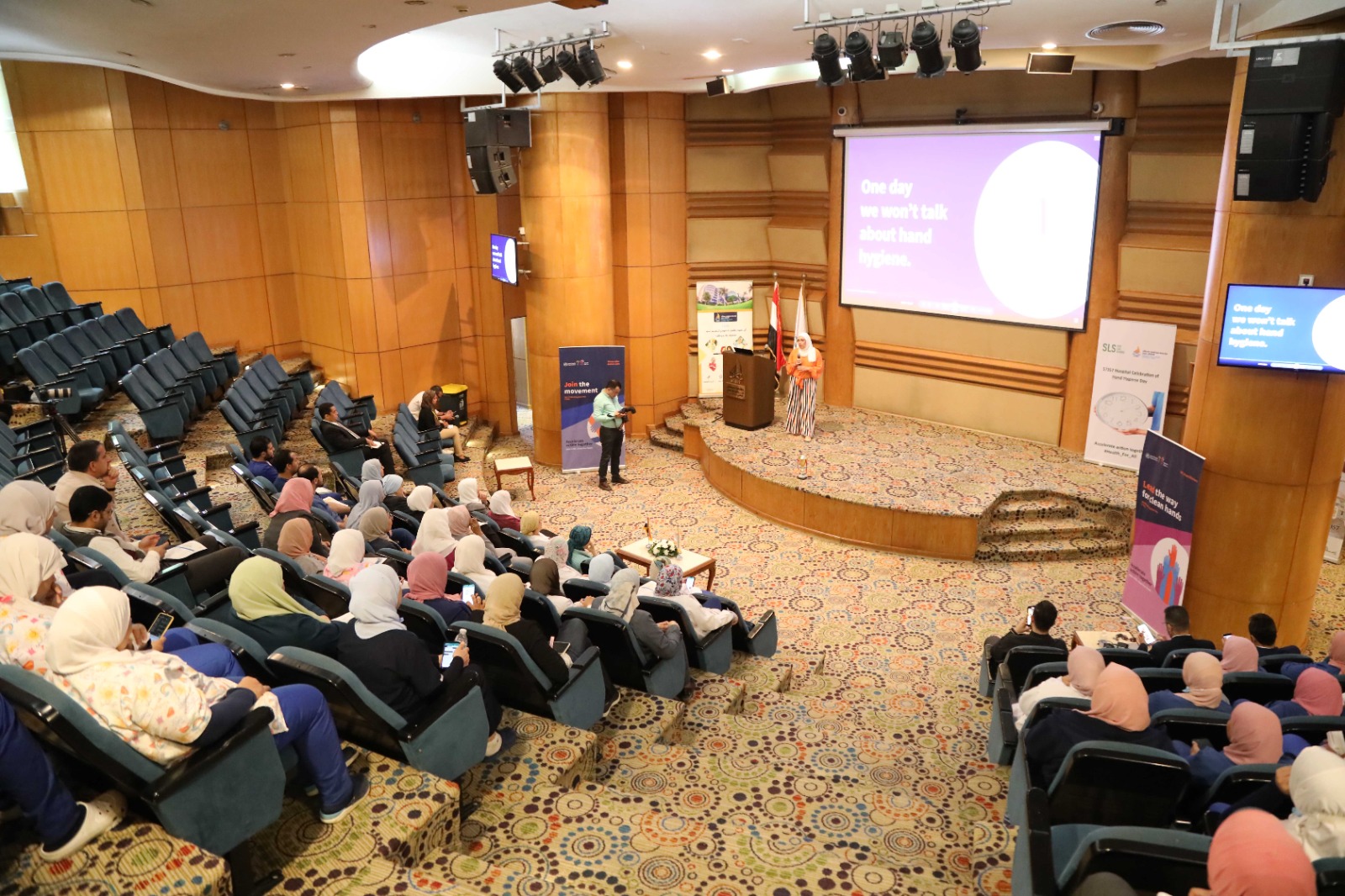 A WHO’s hand hygiene day celebration video was displayed, followed by a video by Hospital 57357 through which Dr. Sali Mohyeldin, from the infection control department, presented information about the importance of cleaning and sterilizing hands. Also a video prepared by the Hospital’s infection control department about washing hands was displayed.