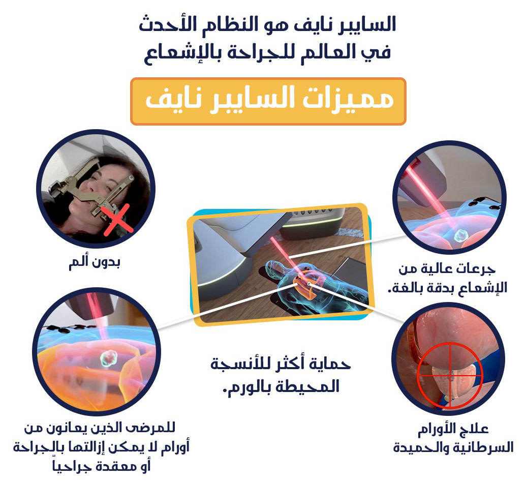 CyberKnife is a completely safe, noninvasive alternative to surgery, in many situations, for the treatment of both cancerous and non-cancerous tumors anywhere in the body, including the prostate, lung, brain, spine, liver, pancreas and kidney by attacking the tumor only without attacking the healthy cells making it very precise and safe, and instead of receiving 38 – 42 radiation sessions this number drops to 5 sessions maximum due to its preciseness.