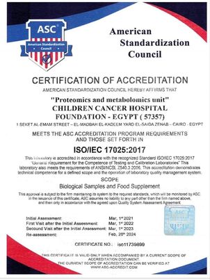 With the constant and tremendous efforts of the proteomics lab team members at CCHE57357 for two years, they were able to meet the international standards of the American council of standardization accreditation. Combined efforts of different Hospital departments were crowned with obtaining the ISO 17025, as the first lab of its kind in Egypt to obtain such accreditation.