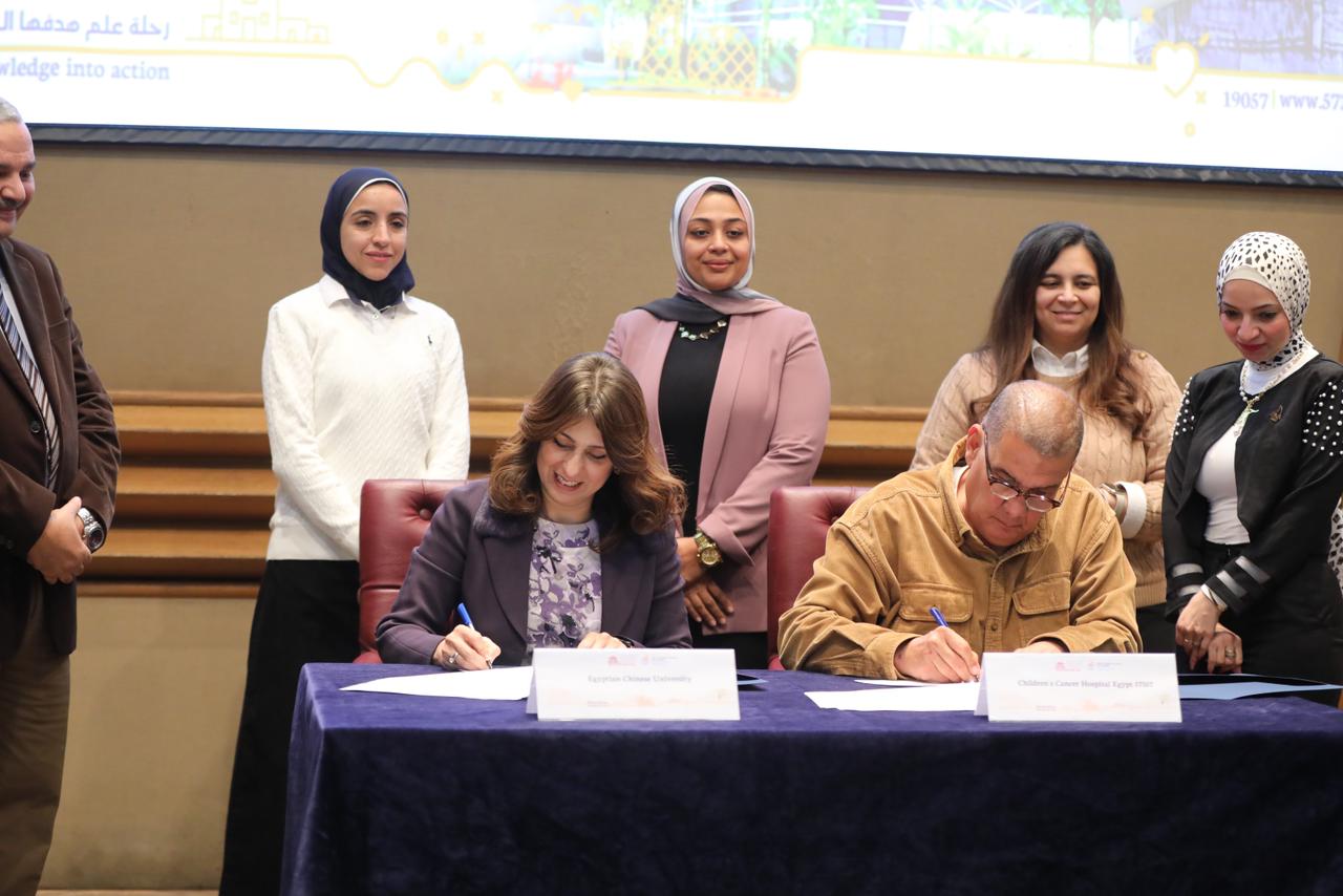 The protocol was signed by Prof. Dr. Sherif Abouel Naga the CEO of 57357 Group and the Hospital’s General Manager, and Dr. Rasha El-Khouly, President of the Egyptian Chinese University, in the presence of Dr. Mina Tadros, Dean of the Faculty of Pharmacy, Dr. Sarah Sabry, and Dr. Nashwa El-Tantawy, from the Department of Clinical Pharmacy, in addition to Dr. Reham Atef, Head of the Department of Clinical Pharmacy, and a number of professors from the university.