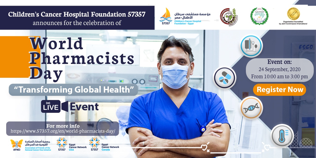 On the occasion of World Pharmacists Day and within Hospital 57357’s leading role in advancing and disseminating the principles of clinical pharmacy in Egypt, the 57357 Institution is organizing and hosting a celebration event on Thursday 24 September 2020 from 10:00 am to 05:00 pm.