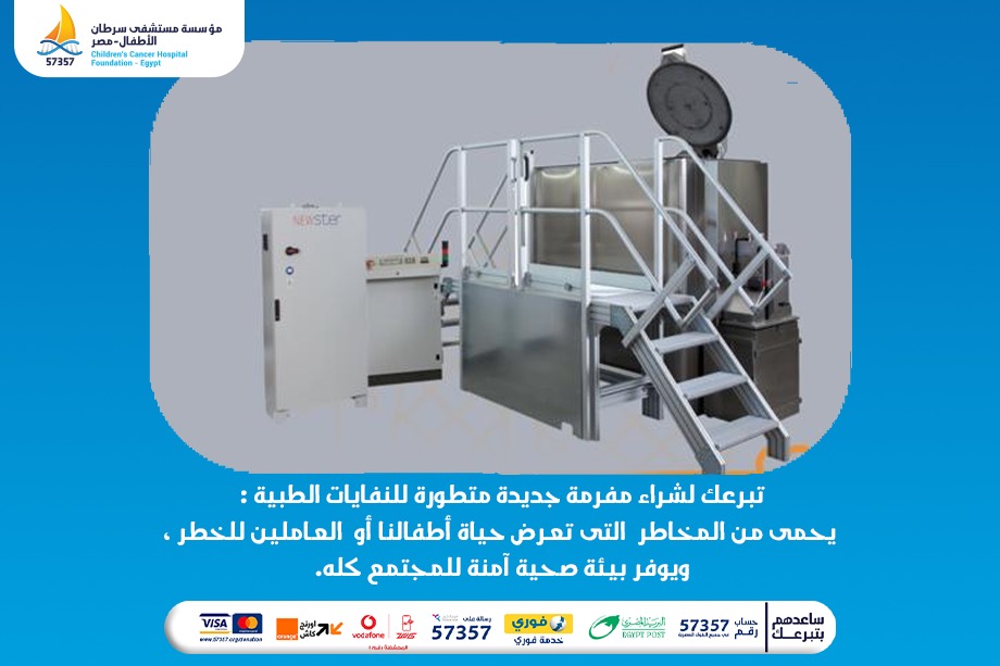 Safe disposal of hazardous waste is one of the most important priorities that Hospital 57357 is committed to since its establishment. Your donation to buy a new advanced chopper for medical waste does not just contribute to protecting the Hospital’s children and employees, it also contributes to protecting the society and the environment from pollution. Medical waste include hazardous materials such as chemicals, labs and surgery wastes, blood and tissue samples, polluted lining and other hazardous wastes that may cause infection and spread diseases if it they are not treated the right way.